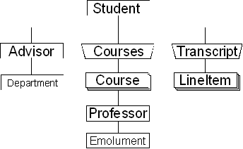 The existence of object properties allows for the creation of object hierarchies in Visual Basic, an example of which is shown below. In this case, an object of type Student has three properties of type Object - Advisor, Courses and Transcript. The Courses object is a special type of object, known as a collection object. Collection objects are designed to hold other objects. This is important since, unless an object is either referred to by a variable or contained in a collection, it will be destroyed by Visual Basic.