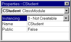 If we want to think in a truly object-oriented manner, we should think of the class CStudent itself as a member of an abstract data type called Class (perhaps it should be CClass, but this is not customary). One of the properties of the class Class is Name. Simply put, every class has a name. The Class data type is managed by the Visual Basic IDE (integrated development environment) and has three properties: Name, Instancing and Public, as you can see from the Properties window of a class module, shown in Figure 1.1. (We will discuss the other two properties in the chapter on OLE automation.) When we use the Insert Class menu option in Visual Basic, we are actually creating a new object of type Class. Visual Basic then assigns to the object's Name property the default value Class1 (or Class2, etc.).